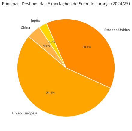Nos primeiros seis meses da safra 2024/25 (julho a dezembro de 2024), o Brasil exportou 430.078 toneladas de suco de laranja concentrado e congelado (FCOJ equivalente a 66 Brix), representando uma redução de 19,7% em relação ao mesmo período da safra anterior. Apesar da queda no volume, a receita das exportações aumentou 42,66%, totalizando US$ 1,88 bilhão, impulsionada pelos preços elevados no mercado internacional.